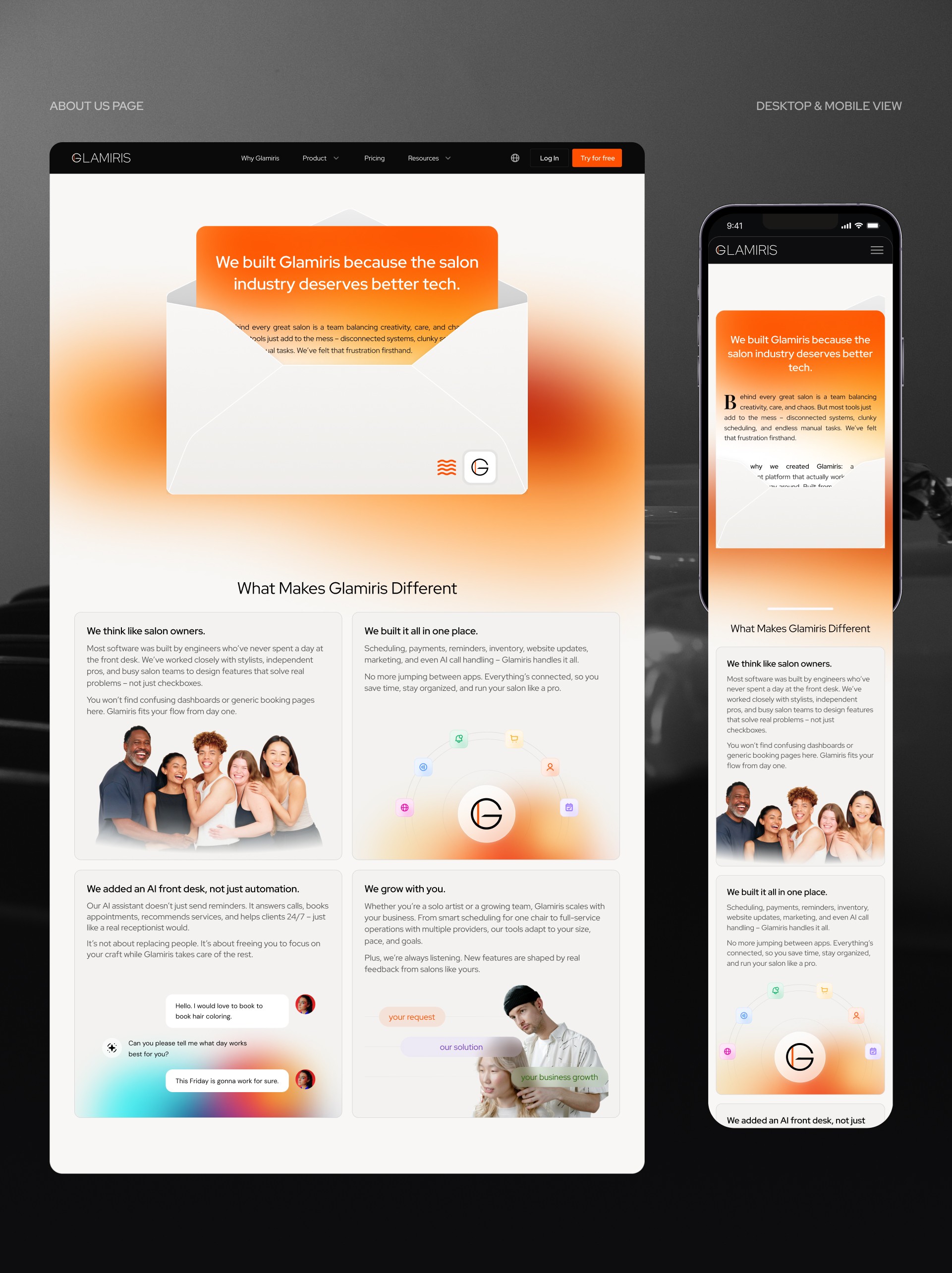 Glamiris positions itself as a brand focused on improving customer relationships in the context of salon software that empowers its capabilities with AI. They emphasize overcoming technological barriers between various platforms like websites, CRM systems, and devices to provide a seamless user experience. Glamiris believes that nurturing these relationships is crucial for sustained success in the salon industry.